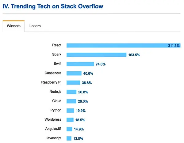 在引领技术趋势的调查中,我们选用的React与Spark分列冠亚军: