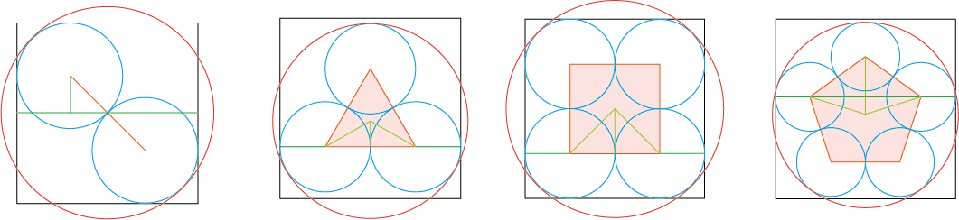 其中黑色正方形就是View的显示区,蓝色圆形就是头像了。已知的条件是View大小,姑且设为 D 吧,还有头像的数量 n ,求蓝色圆的半径 r 及圆心位置。这不就是一道几何题吗?翻开初中的数学课本——勾三股四弦五……好像不够用啊……