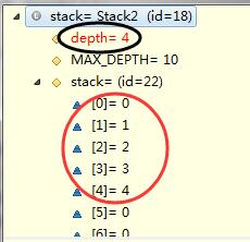 }这种实现方式有个问题,在pop方法中,只是单纯的移动了指针,相当于从堆栈中删除了该元素,其实并没有做到真正删除。虽然也可以实现简单的堆栈功能,但会产生如图所示的现象:
