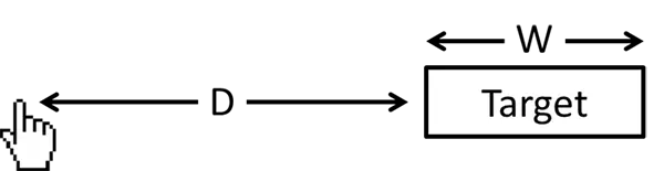 定律内容:从一个起始位置移动到一个最终目标所需的时间由两个参数来决定,到目标的距离和目标的大小(上图中的 D与 W),用数学公式表达为时间 T = a + b log2(D/W+1)。