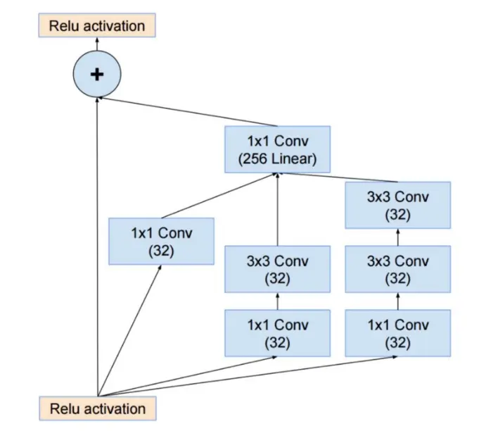 这与这种已有的想法相类似。但是此处,输入绕过了两层卷积,并且被应用到了更大的规模中。将输入直接绕过两层卷积是一个关键的洞察,因为如果只绕过一层并不会带来太多的提升。通过两层可以被认为是一个小型分类器,或者是网络中的网络(Network-in-Network)。