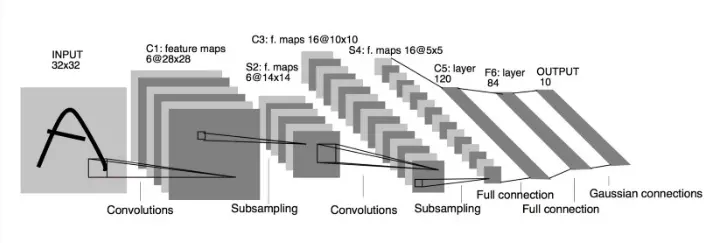 LeNet5 的提出可以追溯到 1994 年,它可以算作最早的卷积神经网络之一,而且有效地推进了深度学习的发展进程。下图展示的是这一富有先驱性的神经网络架构,它是由 Yann LeCun 提出的。LeCun 自 1988 年开始探索,经过多年的成功迭代才最终提出了 LeNet5 。