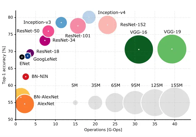 该图展示的了多种主流的神经网络体系架构。其中横轴表示完成一次前向传播所需的操作量,竖轴表示 top-1 准确率。