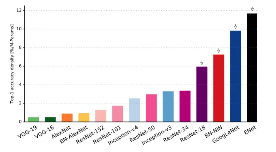 如图所示,ENet 取得了最高的 Top-1 准确率密度。