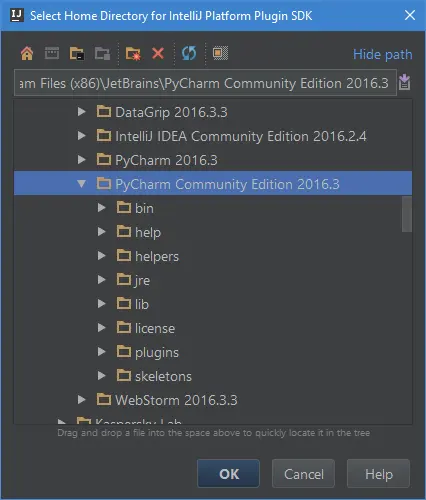 请注意,你也可以使用 PyCharm Professional (旗舰版) 的安装路径作为SDK目录,不过当你调试插件碰到核心代码时,社区版你可以一步一步跟到最里面,但旗舰版不行,因为旗舰版并不是开源的,你拿不到源代码。