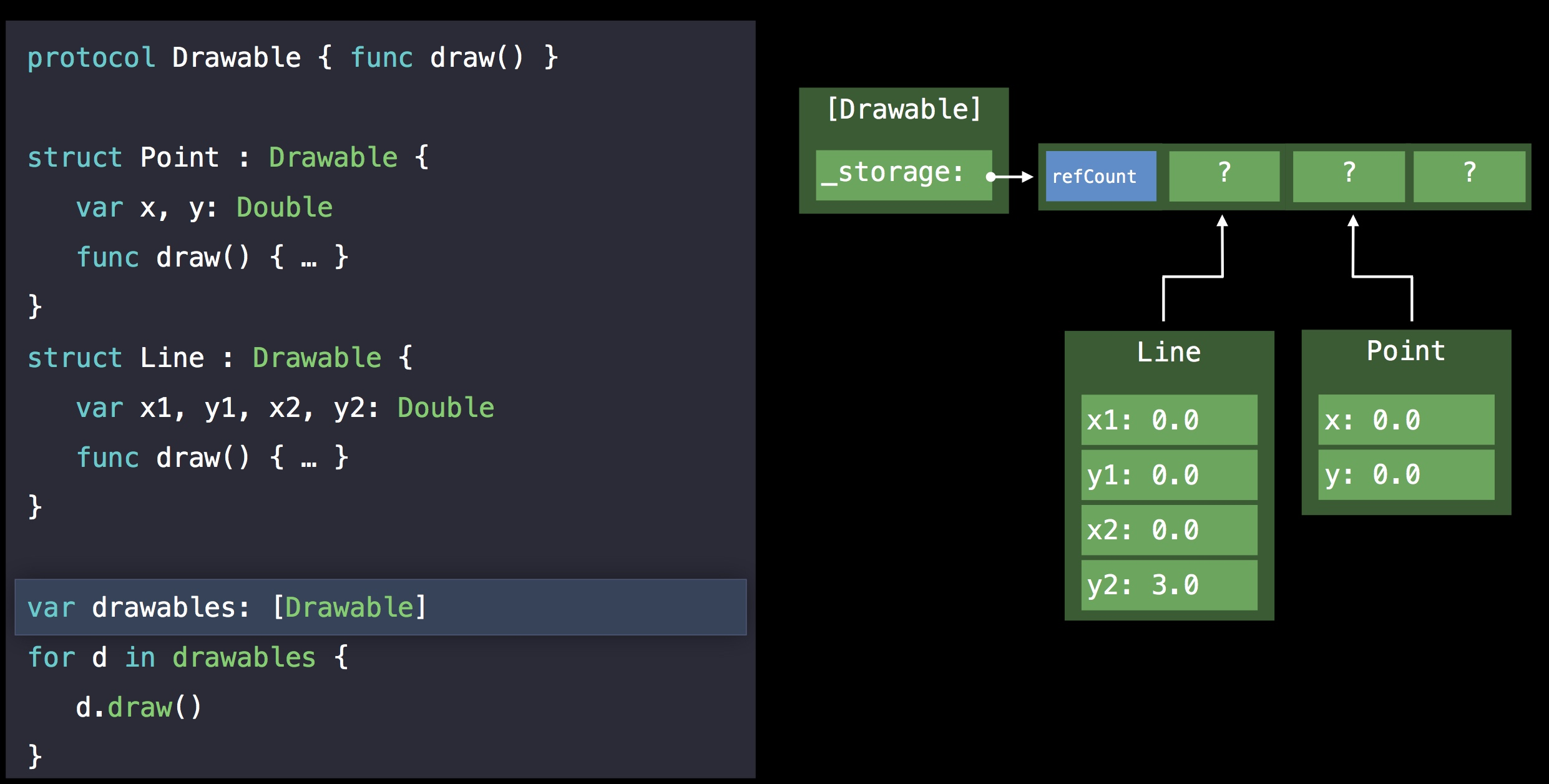 首先,我们把 Drawable 协议当做一个类型,作为 Pair 的属性,由于协议类型的 value buffer 只有三个 word,所以如果一个 struct(比如上文的Line) 超过三个 word,那么会将值保存到堆中,因此会造成下图的现象: