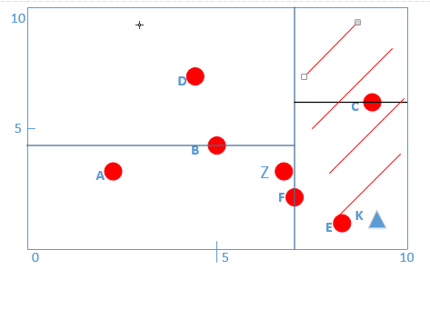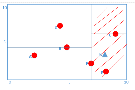 我们此时的K(8.5,1),根据算法第一步得:第一层的x轴K点为8大于F点的7,所以进入F(7,2)的右子树,进入下面红色线条区域: