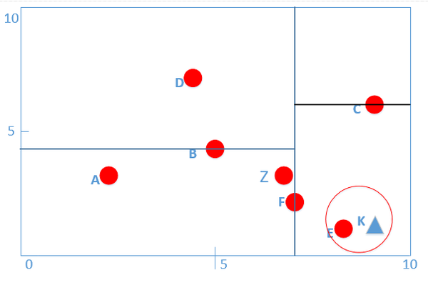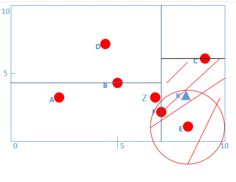 我们可以看出,此时圆与F点有交点,那么说明F点左侧是有可能存在与K点距离更小的点(注:这里我们人为看起来好像没有,但是计算机不知道,必须搜索下去,只要以当前最小值画圆发现与节点切割面有交点,那么一定要进行搜索,不然数据如果是下图:)