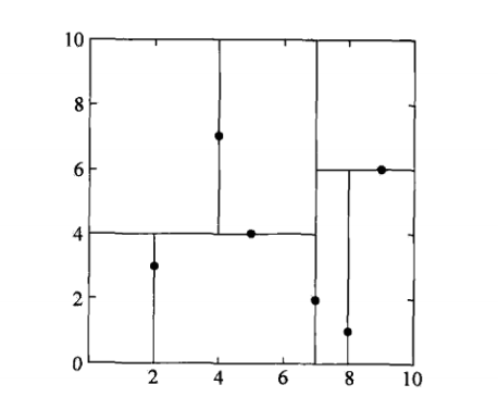 恩,好啦,到这里为止,我们一步一步给出了kd树的构造过程。这也是李航博士书籍上例子中kd树构造的详细过程!他的图片如下: