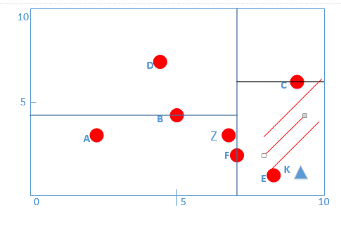 此时对C点进行第(3)步的(a)操作,判断一下KC距离与保存的最近邻距离(这时是KE)比较,KC距离为点K(8.5,1)与点C(9,6)之间的距离>最近邻0.5,于是不更新最近邻点。