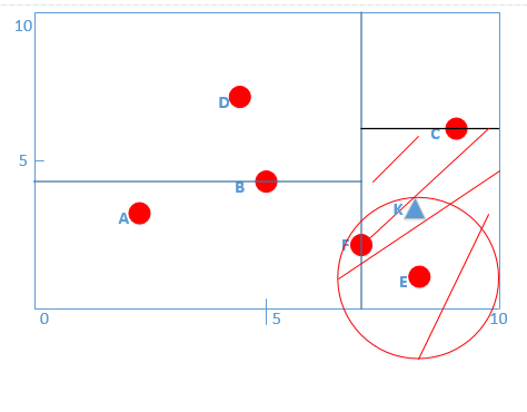 此时对C点进行第(3)步的(a)操作,判断一下KC距离与保存的最近邻距离(这时是KE)比较,KC距离为点K(8,3)与点C(9,6)之间的距离>最近邻2,于是不更新最近邻点。