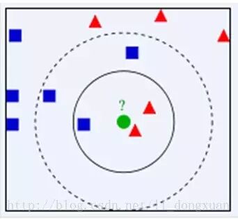 如上图,绿色圆要被决定赋予哪个类,是红色三角形还是蓝色四方形?如果 K=3,由于红色三角形所占比例为 2/3,绿色圆将被赋予红色三角形那个类,如果 K=5,由于蓝色四方形比例为 3/5,因此绿色圆被赋予蓝色四方形类。