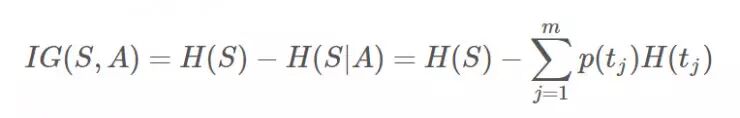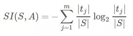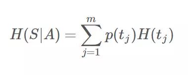 这里,在属性 A 的条件下,数据被划分成 m 个类别(例如,属性 A 是体重,有轻、中、重三个选项,那么 m=3),p(tj) 表示类别 tj(属性 A 中所有具有第 j 个特性的所有数据)的数量与 S 总数量的比值,H(tj) 表示子类别 tj 的熵。