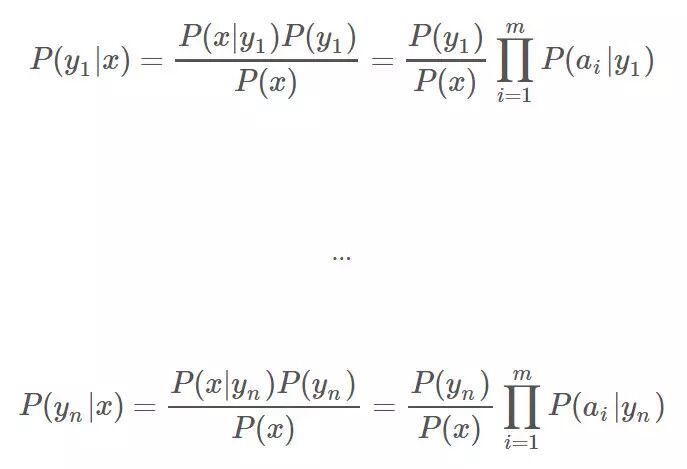 (3)依次计算 x 属于各项分类的条件概率,即计算 P(y1∥x),P(y2∥x),… ,P(yn∥x):