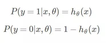 这里 hθ(x) 表示结果取 1 的概率,因此对于输入 x 分类结果为类别 1 和类别 0 的概率分别为: