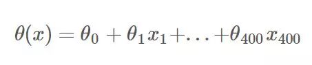 假设我们现在要解决的是识别图片中的 0 或 1(样本库只有 0 和 1 的图片),图片大小是 20*20,那么这个时候有 400 个特征向量,那么边界函数为: