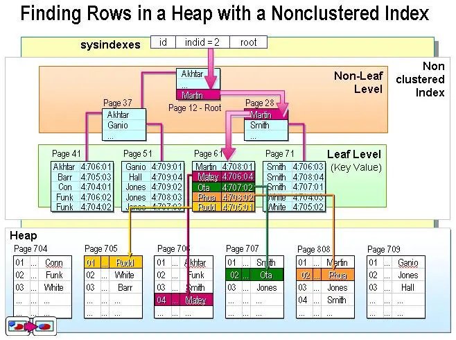 如果您认识某个字,您可以快速地从自动中查到这个字。但您也可能会遇到您不认识的字,不知道它的发音,这时候,您就不能按照刚才的方法找到您要查的字,而需要去根据“偏旁部首”查到您要找的字,然后根据这个字后的页码直接翻到某页来找到您要找的字。但您结合“部首目录”和“检字表”而查到的字的排序并不是真正的正文的排序方法,比如您查“张”字,我们可以看到在查部首之后的检字表中“张”的页码是672页,检字表中“张”的上面是“驰”字,但页码却是63页,“张”的下面是“弩”字,页面是390页。很显然,这些字并不是真正的分别位于“张”字的上下方,现在您看到的连续的“驰、张、弩”三字实际上就是他们在非聚集索引中的排序,是字典正文中的字在非聚集索引中的映射。我们可以通过这种方式来找到您所需要的字,但它需要两个过程,先找到目录中的结果,然后再翻到您所需要的页码。我们把这种目录纯粹是目录,正文纯粹是正文的排序方式称为“非聚集索引”。