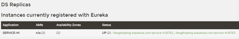 基于上一节的工程,启动eureka-server 工程;启动service-hi工程,它的端口为8762;将service-hi的配置文件的端口改为8763,并启动它,这时你会发现:service-hi在eureka-server注册了2个,这就相当于一个小的集群。访问localhost:8761如图所示: