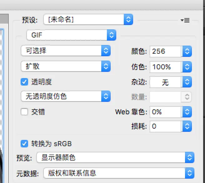 使用photoshop打开一张图片,选择“文件 -> 存储为Web和设备所用格式”,在弹出的界面右上角选择“GIF ”格式,我通常选择可选择和可扩散这两个选项,如图所示: