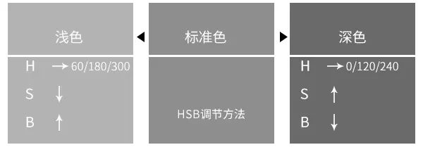 HSB简单解释一下,H代表色相,S代表饱和度,B代表亮度。一众设计师们这里就不用再普及基础的色彩知识了。这里只说方法和应用。