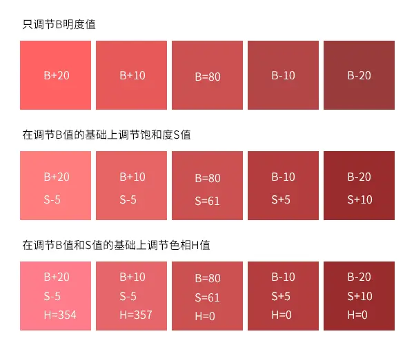 这里面最好理解的是明度的调节,增加和降低明度来实现深浅色的变化,那为何要调节饱和度呢?而且越浅的颜色饱和度越低?