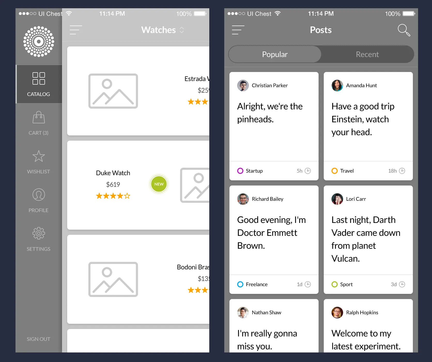 先做一个无任何配色方案的APP的两个界面,为了简化,我只在界面中使用基于标准色的一个浅色和一个深色,用灰度表示企业的标准色,深色和浅色则对应了深灰和浅灰。