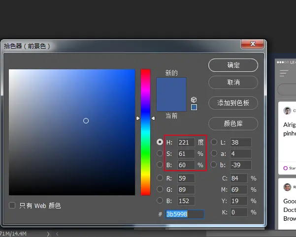 在网上搜到facebook的标准色为#3b5998,对应HSB的值为221,61,60。