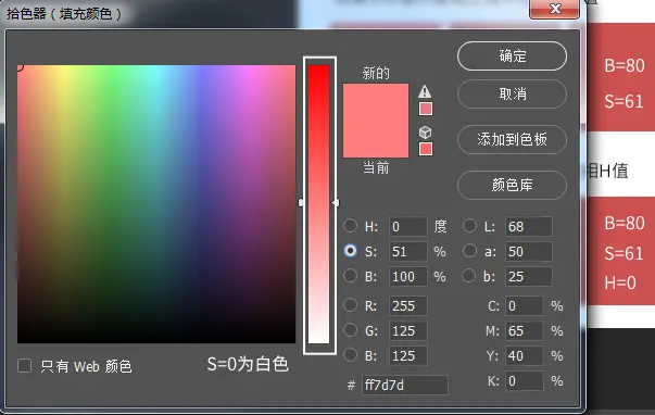 深浅色和饱和度S的相关性我们可以借助ps拾色器理解一下,如下图,当选中S模式时,很明显看到随着S的增加,颜色呈现深→浅的过程,当S调节到0时,达到浅色的极致,即白色。
