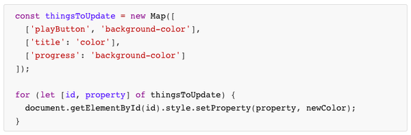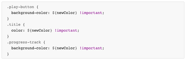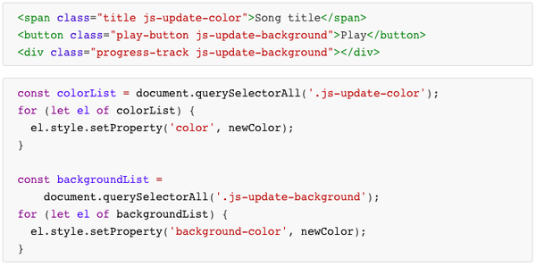 以音乐播放器为例,如果你希望界面颜色随着当前收听专辑的更改而变化,从前你需要维护一系列会出现颜色变化的元素以及属性,需要的时候依次更改: