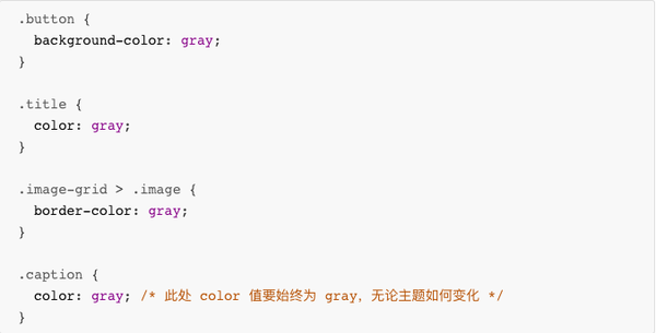 用 CSS 自定义属性作为主题色的变量后,一旦要调整,只需要改动一个地方就能全局生效。不止如此,--theme-color 这个变量名已经带上了语义,之前只是用 gray 的时候,我们并不知道当主题色发生变化的时候,特定元素的字体颜色是否也需要随之改变。使用该变量后,就没有了这样的困扰。