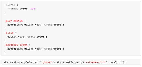 但通过自定义属性,问题能得到不小的简化:只要改变位于 DOM 结构中最高点的元素,接着让浏览器去改变该节点之下的节点: