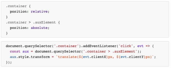 虽然上面这段代码能实现我们想要的效果,但 JS 不仅需要直接操作那个辅助性元素(理想情况下,它甚至不应该知道这个元素的存在),还需要通过内联样式修改这个元素的 transform 属性值。