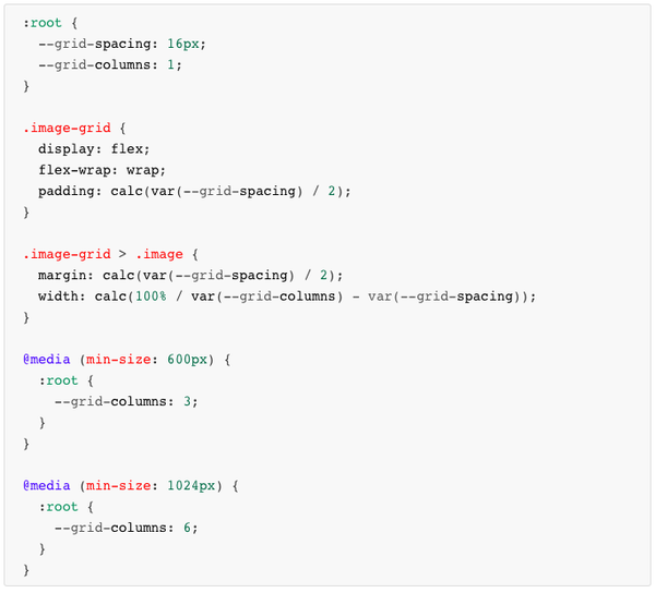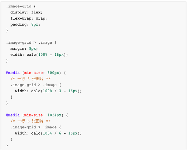 熟悉 CSS 盒模型的你应该很熟悉上面的代码吧:16px 宽的边距,.image 间有 16px 宽的间隔。但从 CSS 角度来看,这段代码还不够直观足以代表最终的网格效果,我们真正关心的东西也不能从代码中凸显出来。