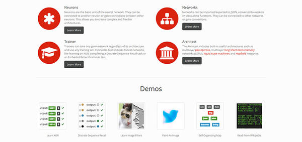 虽然不再积极的被维护了,ConvNetJS是最深入的JavaScript学习库。最初在斯坦福大学里被开发,ConvNetJS在GitHub上变得非常流行,许多社区开始驱动新的特性和指导手册。它直接在浏览器运行,支持多个学习技术,并且它非常的初级,更适合人们更多的体验神经网络。