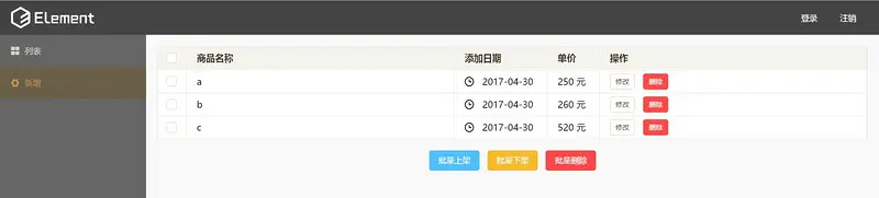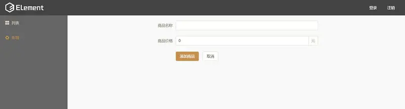 我们的页面很简单,主要有两个组件list.vue(展示所有数据和相关操作),一个form.vue(新增及修改商品),这么一个页面各位前端估计啪啪几下就搞定了吧,至于你用不用element-ui都无所谓,用的话速度快点颜值高点。大家请无视我项目里使用了pug(jade)模板,饿了么主题文件、登录组件等,这只是为了方便以后扩展。