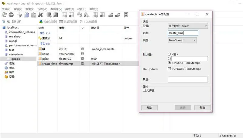 来到后端第一步就是创建一个数据库,这里我用的是phpstudy附带的,当然你也可以自己装,毕竟这个附带的还是老旧的5.5版本。sql语句我玩不来啊就用phpstudy附带的mysqlfront这个gui工具来撸了。建一个叫vue-admin的库,然后一张goods的表,只有id,name,price,create_time这四个字段,简单明了。