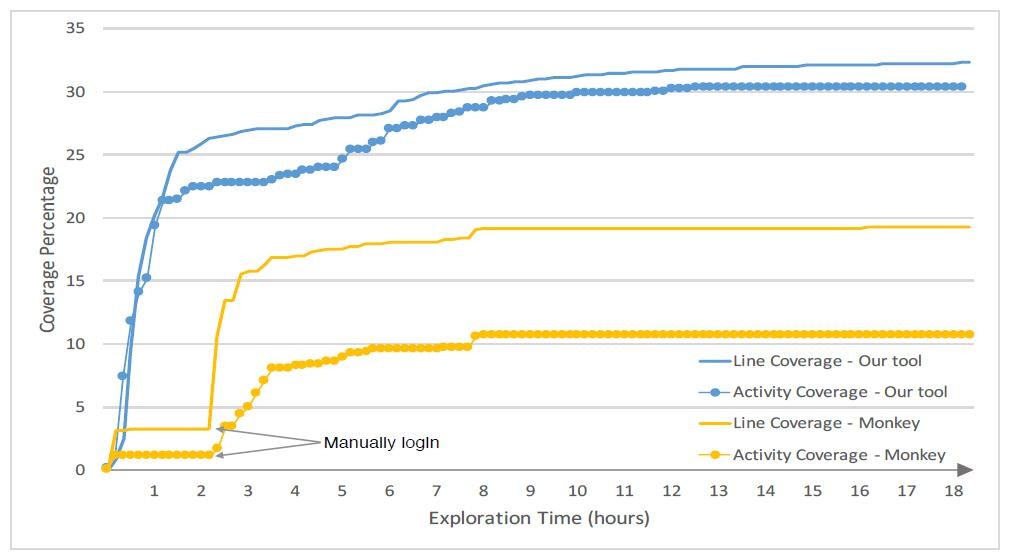 从上图可以看出,相对于原生的monkey,行覆盖率大约有80%的提升,activity覆盖率大约有将近200%的提升。而且从曲线上可以看到,这两个monkey在登录之后的1个小时以内,行覆盖率和activity覆盖率都有明显的提升,在1到2个小时以内也会缓慢提升,而两个小时之后提升就非常缓慢了。