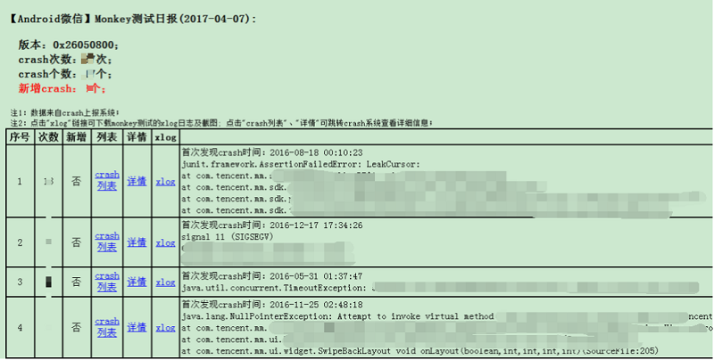 微信团队每天都会取最新代码编的apk包进行稳定性测试,收集出现的Crash,并且把新出现的Crash,提交bug给对应开发。