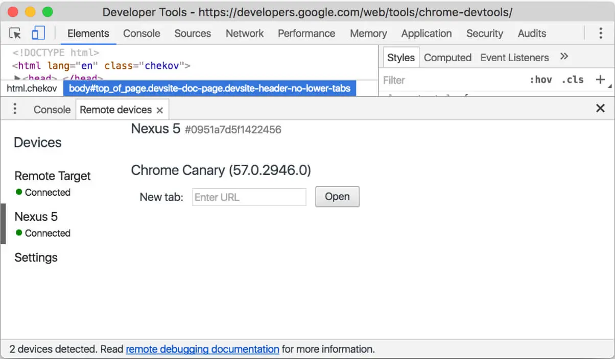 在此,我们可以输入任意的 Url 地址,点击 Open,便可同步打开手机 Chrome 上的网页,同时在 Remote devices 出现对应的地址栏,点击即可进入前面介绍 WebView 时所看到的类似调试页。