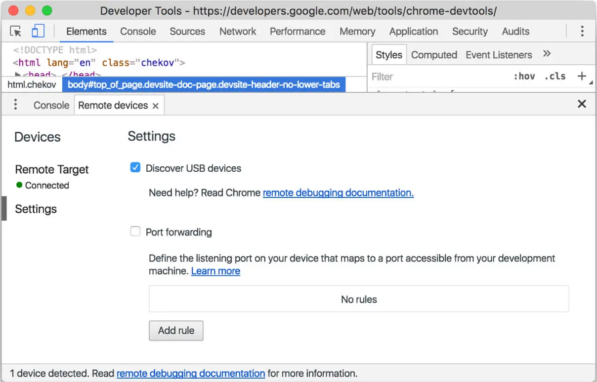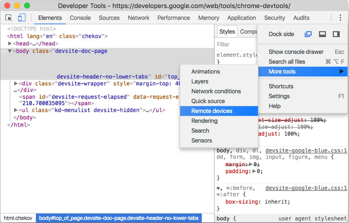 打开 PC 中 Chrome 浏览器的开发者工具页面:设置 -> 更多工具 -> 开发者工具,或者直接在 Chrome 浏览器的任意网页上右键选择 检查。在开发者工具按照下图方式中打开 Remote devices :
