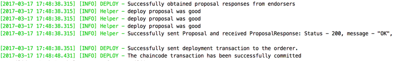 执行deploy脚本注册并部署chaincode$ node deploy