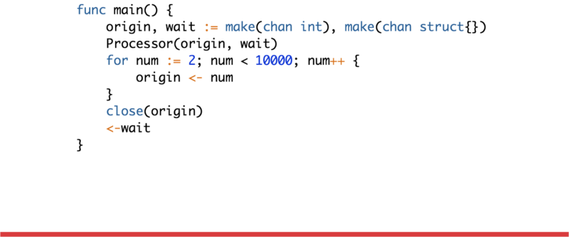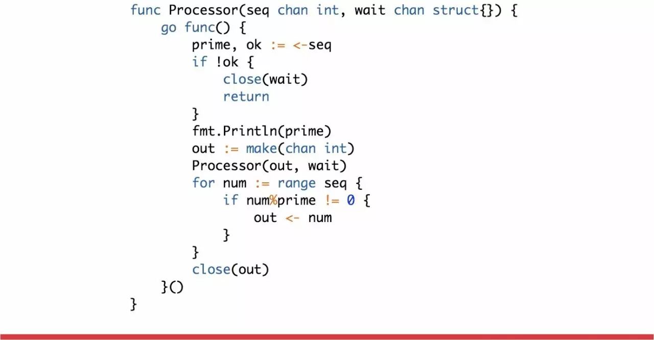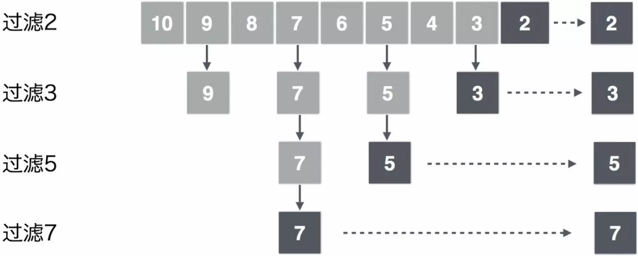 从上图中可以看出,每一行过滤使用独立的并发处理程序,上下相邻的并发处理程序传递数据实现通信。通过4个并发处理程序得出10以内的素数表,对应的 Go 实现代码如下: