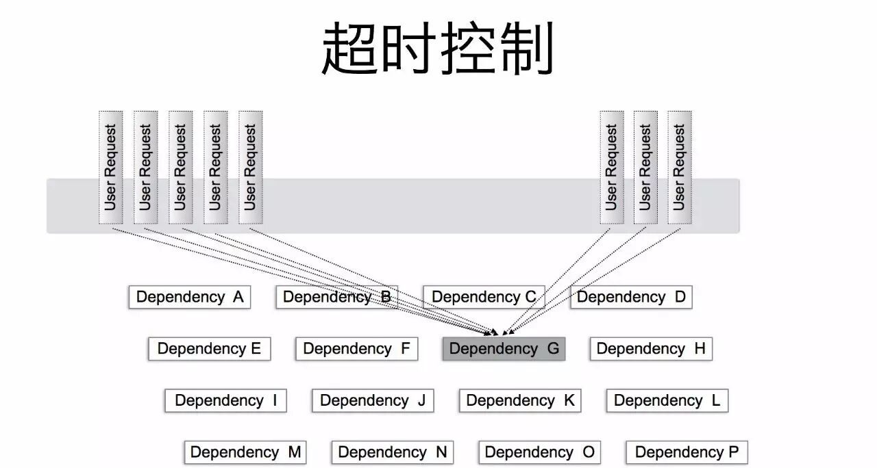 图中被依赖的服务G由于某种原因导致响应比较慢,因此上游服务的请求都会阻塞在服务G的调用上。如果此时上游服务没有合理的超时控制,导致请求阻塞在服务G上无法释放,那么上游服务自身也会受到影响,进一步影响到整个调用链上各个服务。