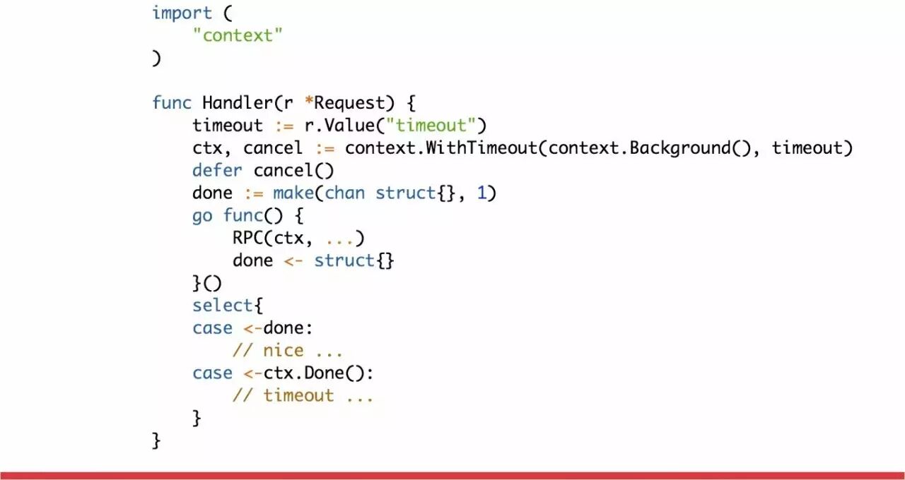 Wait和Cancel两种并发控制方式,在使用 Go 开发服务的时候到处都有体现,只要使用了并发就会用到这两种模式。在上面的例子中,GW 启动5个协程发起5个并行的 RPC 调用之后,主协程就会进入等待状态,需要等待这5次 RPC 调用的返回结果,这就是 Wait 模式。另一中 Cancel 模式,在5次 RPC 调用返回之前,已经到达本次请求处理的总超时时间,这时候就需要 Cancel 所有未完成的 RPC 请求,提前结束协程。Wait 模式使用会比较广泛一些,而对于 Cancel 模式主要体现在超时控制和资源回收。