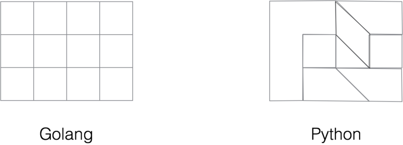 同样是拼成一个正方形,Go 只有一种方式,每个单元都是一致。而 Python 拼接的方式可能可以多种多样。