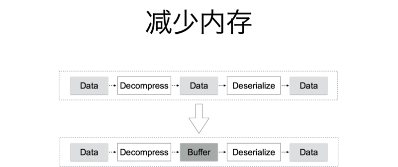 这个接口定义了 Read 方法,任何实现该接口的对象都可以从中读取一定数量的字节数据。因此只需要一段比较小的内存 Buffer 就可以实现从解压缩到反序列化的过程,而不需要将所有数据解压缩之后再进行反序列化,大量节省了内存的使用。