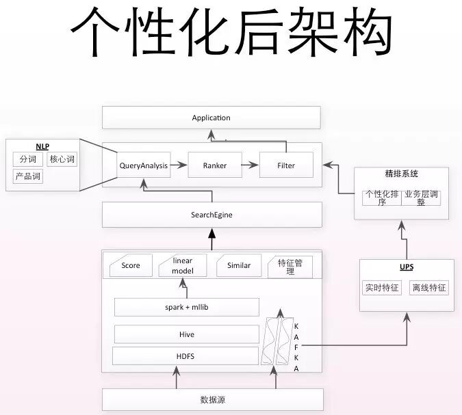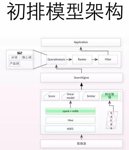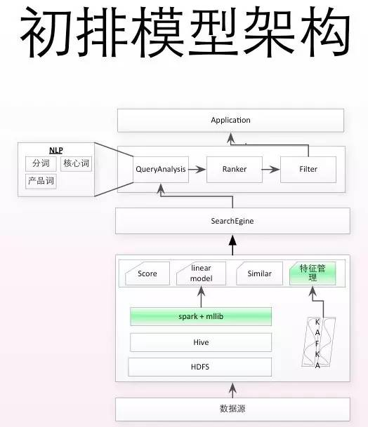 简单介绍一下初排模型的架构,最下面是数据源,上来之后主要是 Hadoop 的生态,HDFS 到 hive,再上来就是 spark。所以刚才有人问 spark 在电商领域的应用,基本上机器学习的话,spark 已经支持非常很好了,可能在使用过程中会遇到一些问题,但它的社区非常活跃,基本上可以找到问题的解答。通过spark 模型产出之后,有特征的管理平台。再根据我们搜索引擎去把分数推上去,搜索引擎在前端有流量分发和 query 的改写。个性化加入之后,有个用户行为(接 kafka 存储东西),这边有一个 UPS,这里有个精排系统,和引擎是两层。也就是说引擎出牌召回之后,会在精排里做一些个性化的设置,用户的设置是从精排里去取得的,这样就完成了个性化的排序框架。