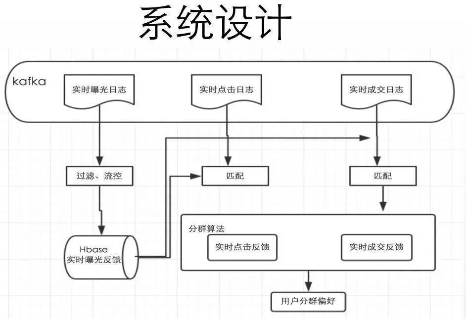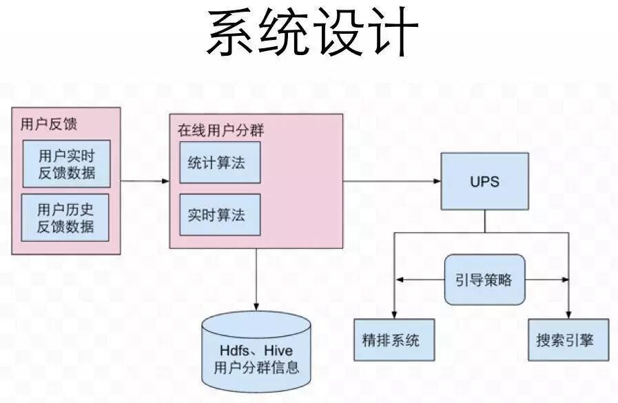 然后我们针对这种情形做了系统设计,前面这个是基于 kafka,它是 spark stream 做的,基于流式处理,有 kafka 的用户数据接入进来之后,有一个实时统计和离线统计的用户分群的算法。依靠一个 UPS 系统,我们可以通过一些概率引导他可能偏好的商品。这可以有效减少用户升级带来的损失。很多用户进来看到的排序,除了他本身的个性化之外,还会被一些我们希望扶持的店,引导他希望关注的人群。