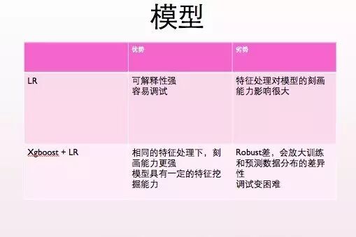 这里可以进一步讲整个模型是怎么做的。这里有两个模型,我们都做了。第一个模型是 LR(Logistic regression),它是线性的,用的非常多。百度在 14 年之前,在深度学习没有像现在应用出来之前,LR 效果是最好的。业界上有各种模型各种迭代,但他们的 LR 是最好的,他们的 LR 做到千亿维度的 feature,在凤巢那边。它有一个好处是,它支持你调试,可解释性强,非常适合你通过这样的模型去理解业务分布是怎样的。它的劣势是你要做非常多的特征工程的事情,如果特征工程做得不好,这个模型就不太好。第二个的 Xgboost+LR 的模型,是 Facebook 在 15 年提出来的,他们说效果非常好。我们拿过来用了之后确实比较好,它有一个非常好的地方,它是开源工具,它背后是实现了 gbm 的算法,它可以自动帮你找到一些非常多的特征,一些高维的抽象的特征,在人肉做一些特征事情上减少很多工作量,这样就可以在样本上或者其他地方发力。这其实是一个效率问题,并不是说 LR 不可以做出这样的模型,但你付出的成本是有本质的差距的。Xgboost+LR 我们遇到的问题是,它的泛化能力偏弱,因为它模型的原理是算残差的值,所以它的数字节点切得非常细。在切的过程中,如果突然有一天数据分布突然变化比较大的时候,很多切出来的 feature 的特征是不对的,这时候用它有一些问题。它的模型也比较复杂,如果两百多棵树,每棵树有 4 层,这是非常典型的 Xgboost 的结构,这时候要很难理解这个模型到底帮你做出了什么事情。所以调试要困难一些,很多时候你是通过自己设计 case了解这个模型是什么情况。