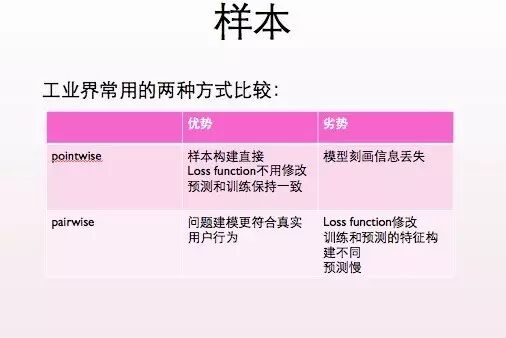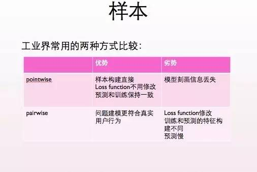 工业界有 2 种常用的方式,第一种叫 ponitwise,另一种是 pairwise。point 是排序的时候,商品是单独的去考虑的,比如 A 就是A,不会去和 B 考虑,而 pair 是更接近用户真实的行为,比如说进淘宝搜索“连衣裙”,会出现一批商品,它是前后或者一组商品对比会对你造成决策上的影响,所以它是把两个两个的商品组合成样本,区分正副样本。第三种是 listwise,更真实,一次 query 看到 10 个,就是 10 个一起去做组,这种会更复杂。